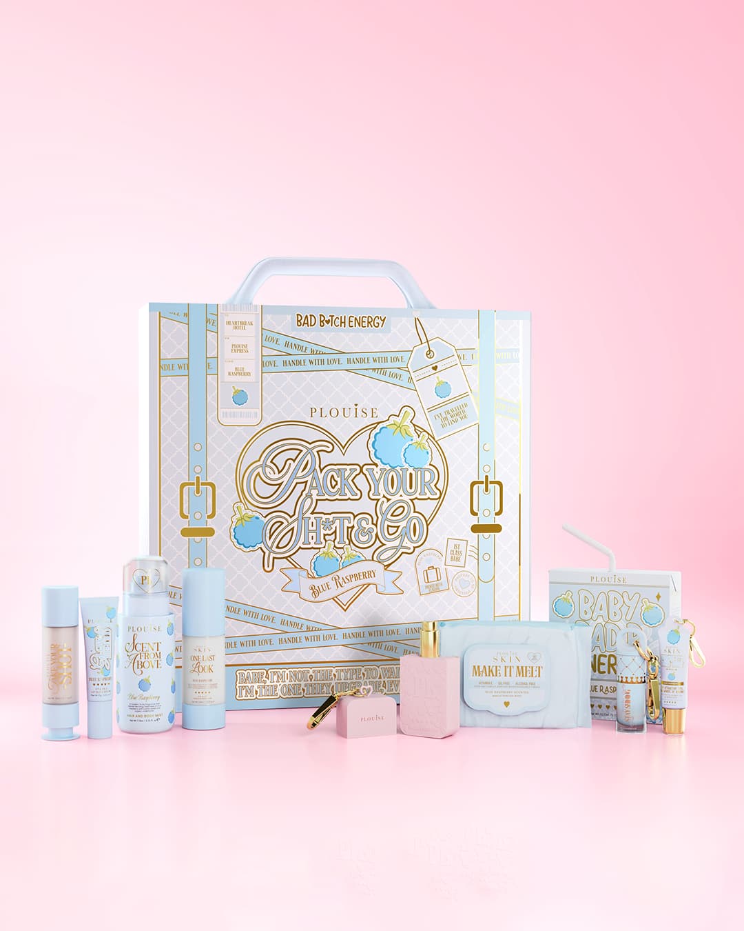 Each Pack Your Shit & Go Suitcase features a curated edit of skincare, lip care, cleansing essentials, and fragrance favourites, created exclusively for this set.
